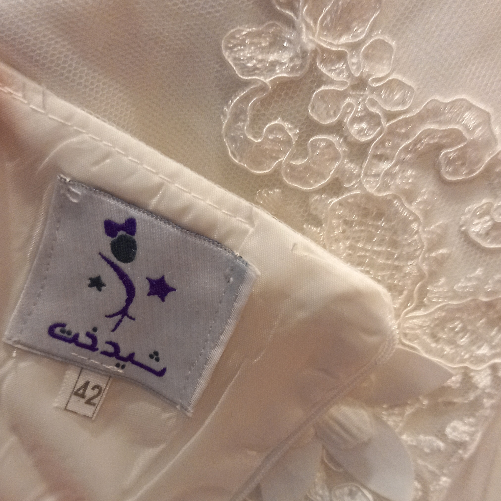 پیراهن از جنس کرپ مازراتی مرغوب نباتی رنگ است. لباس کاملا آسترکشی شده و دارای دامن مدل ماهی است. یقه آن شکاری نصب شده بر روی یقه هفت هالتر می باشد. پشت لباس در قسمت بالاتنه با گیپور کار شده و زیپ مخفی دارد.